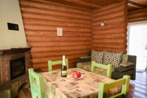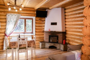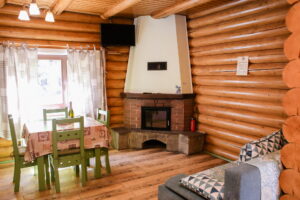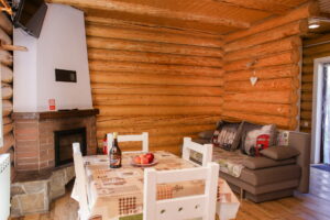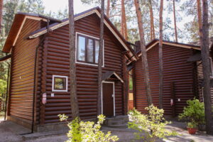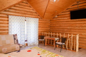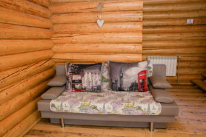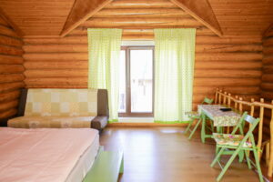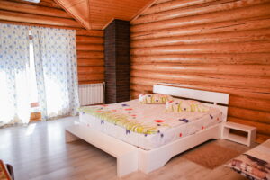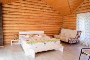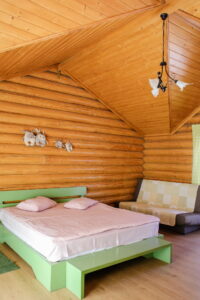 Отдохнуть с комфортом на природе в Коробовых Хуторах в Харьковской области предлагает база отдыха «Задонецкая дача». Коричневый домик для гостей в два этажа разместит на своей территории семью или компанию друзей из 4 человек. Большая спальная комната оборудована удобной двуспальной кроватью и диваном, где могут разместиться два ребенка. В гостиной с уютным камином, стоит диван, который может стать спальным местом еще для двоих человек.